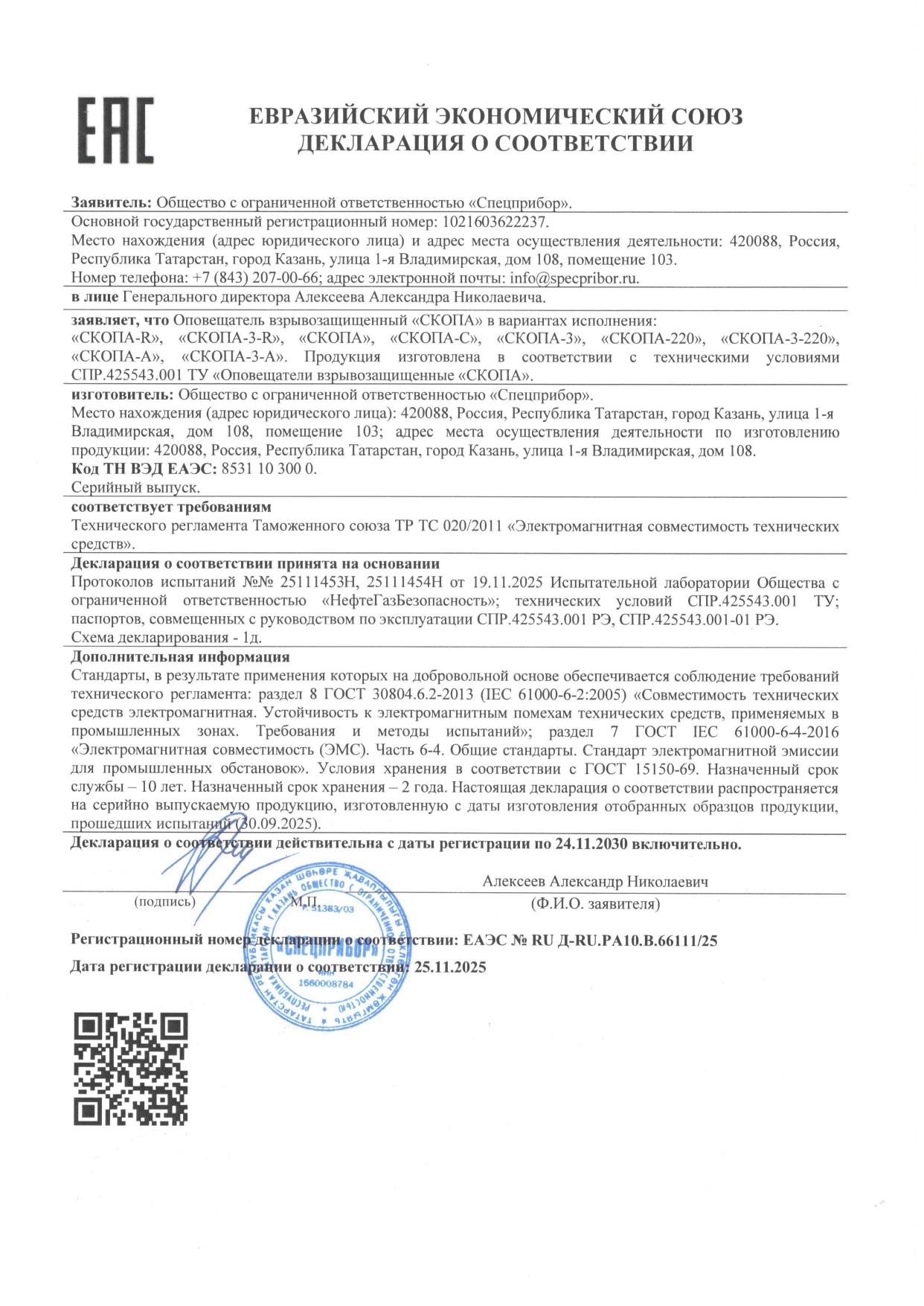 СКОПА-З-A (звуковое, адресное) свето-звуковое -55...+55 1Ex [ib] mb IIB T6 Gb =12 / 24В +